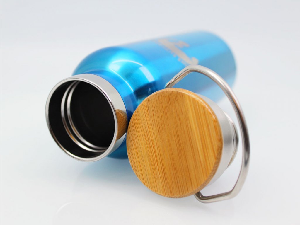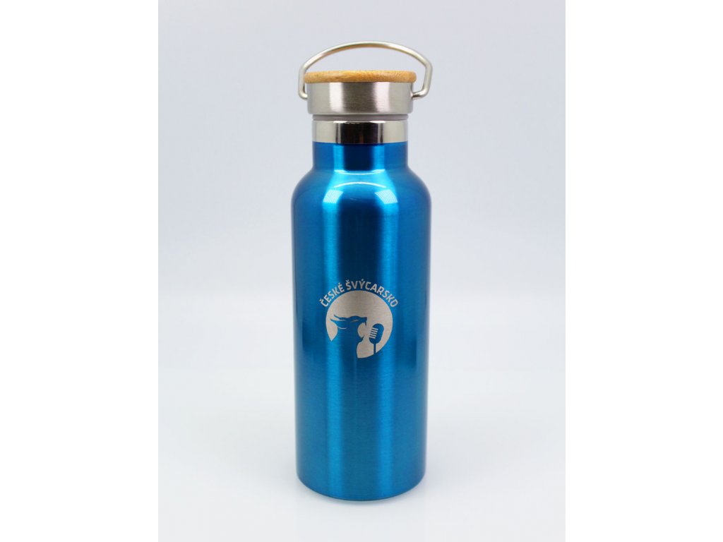 Dvouplášťová, nerezová termoska 500 ml, s motivem podcastu Českého Švýcarska. Kovový šroubovací uzávěr s bambusovým povrchem a kovovým poutkem. Barva tyrkysová.